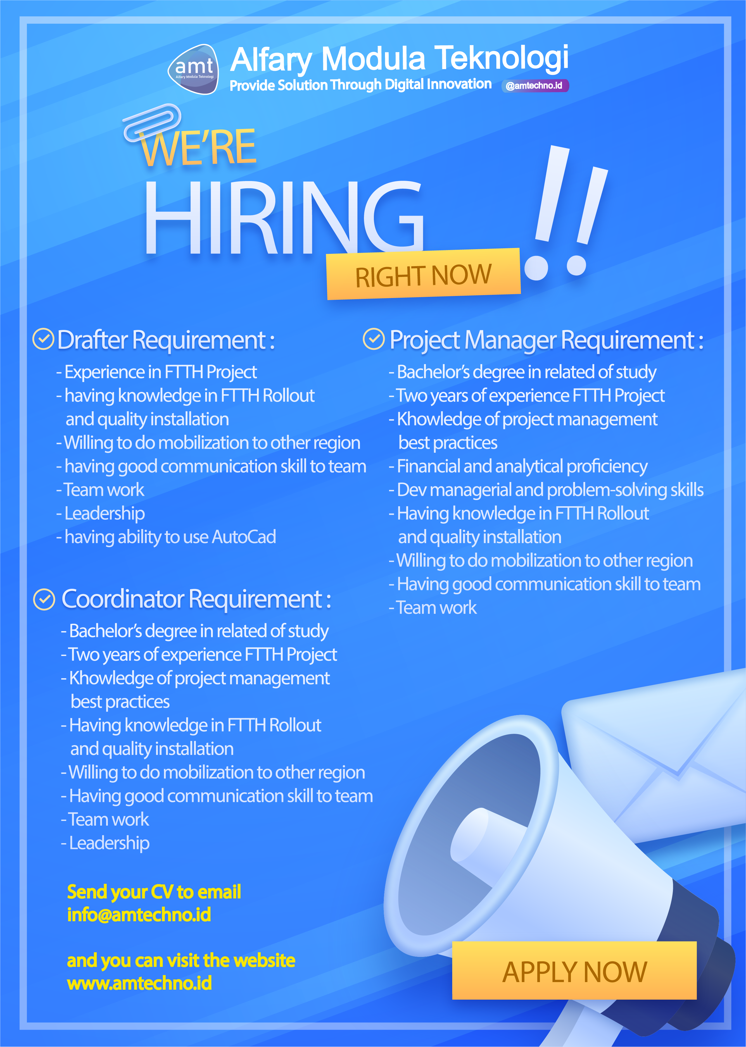 - Having knowledge in FTTH Rollout and quality installation